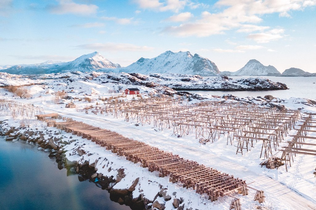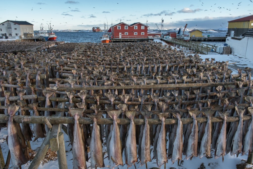 Querini, colpito dalle loro abitudini, osservò come il pesce — merluzzi appesi su lunghi tralicci di legno — si essiccasse al vento e al gelo, diventando duro come il legno: lo “stokkfisk”, da cui deriva il nostro “stoccafisso”.