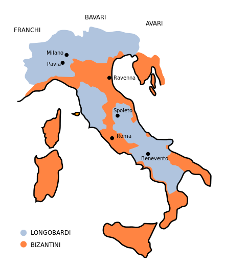 La discesa in Italia dei Longobardi, attraverso l’Isonzo, non trovò particolari resistenze dalle forze imperiali, considerando che l’Italia veniva da una massacrante guerra gotica, se non per la città di Pavia che fu conquistata nel 572 d.C. dopo tre anni di assedio. La prima città a cadere nelle mani di Alboino fu Cividale del Friuli, poi cedettero, in rapida successione, Aquileia, Vicenza, Verona, Brescia e quasi tutte le altre città dell’Italia nord-orientale. Nel settembre 569 d.C. aprirono le porte agli invasori Milano e Lucca e nel 572 d.C., come detto, dopo tre anni di assedio cadde anche Pavia che divenne capitale del Regno. Re Alboino fu quindi il primo vero Re d’italia, era molto amato dal popolo per la fama di grande condottiero, ma fu ucciso il 28 Giugno del 572 d.C. a causa di una congiura organizzata dalla moglie Rosmunda.
