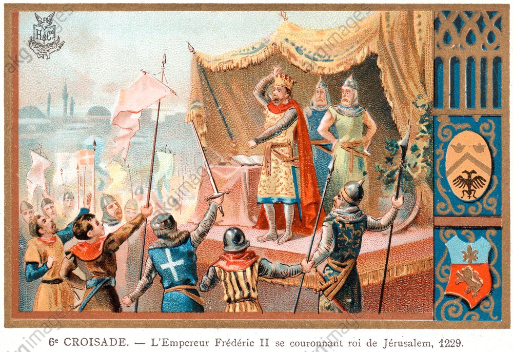 Federico II di Svevia guidò la Sesta Crociata tra il 1228 e il 1229, conquistando Gerusalemme senza combattimenti. La sua impresa si distinse per l’assenza di spargimenti di sangue, risolta attraverso accordi diplomatici con il sultano al-Malik al-Kāmil. Il 17 marzo 1229, Federico ricevette la corona di Re di Gerusalemme, nonostante fosse stato scomunicato da Papa Gregorio IX. Questa crociata portò a un significativo aumento degli scambi culturali tra Oriente e Occidente, ma la pace durò solo fino alla morte del sultano.