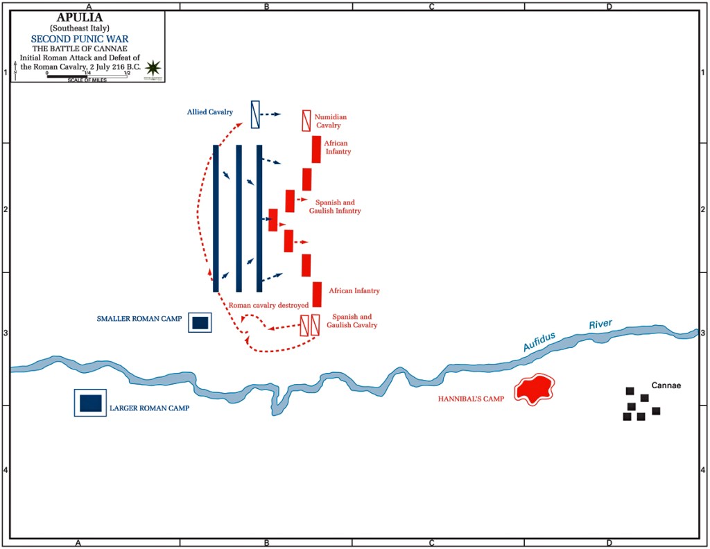 La cavalleria numida, dopo aver sconfitto quella romana, attaccò alle spalle completando l’accerchiamento.