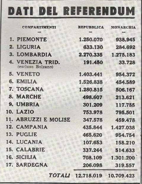 Repubblica: 12.718.641 voti (54,3%) – Monarchia: 10.718.502 voti (45,7%)