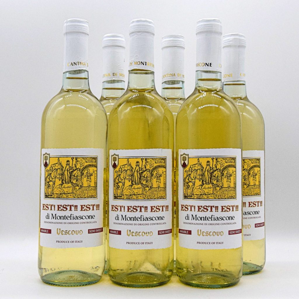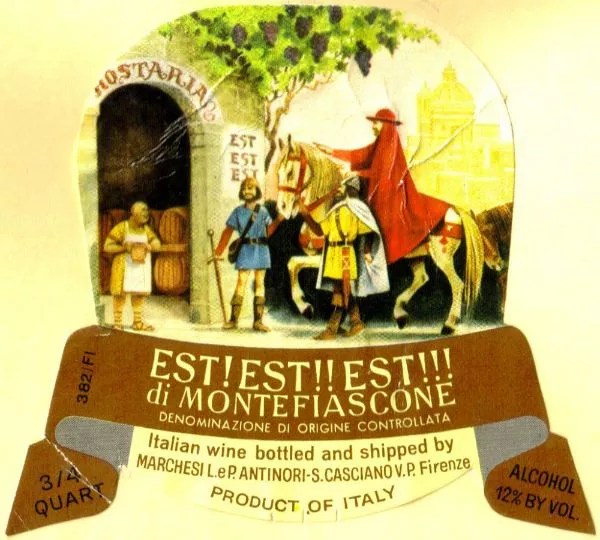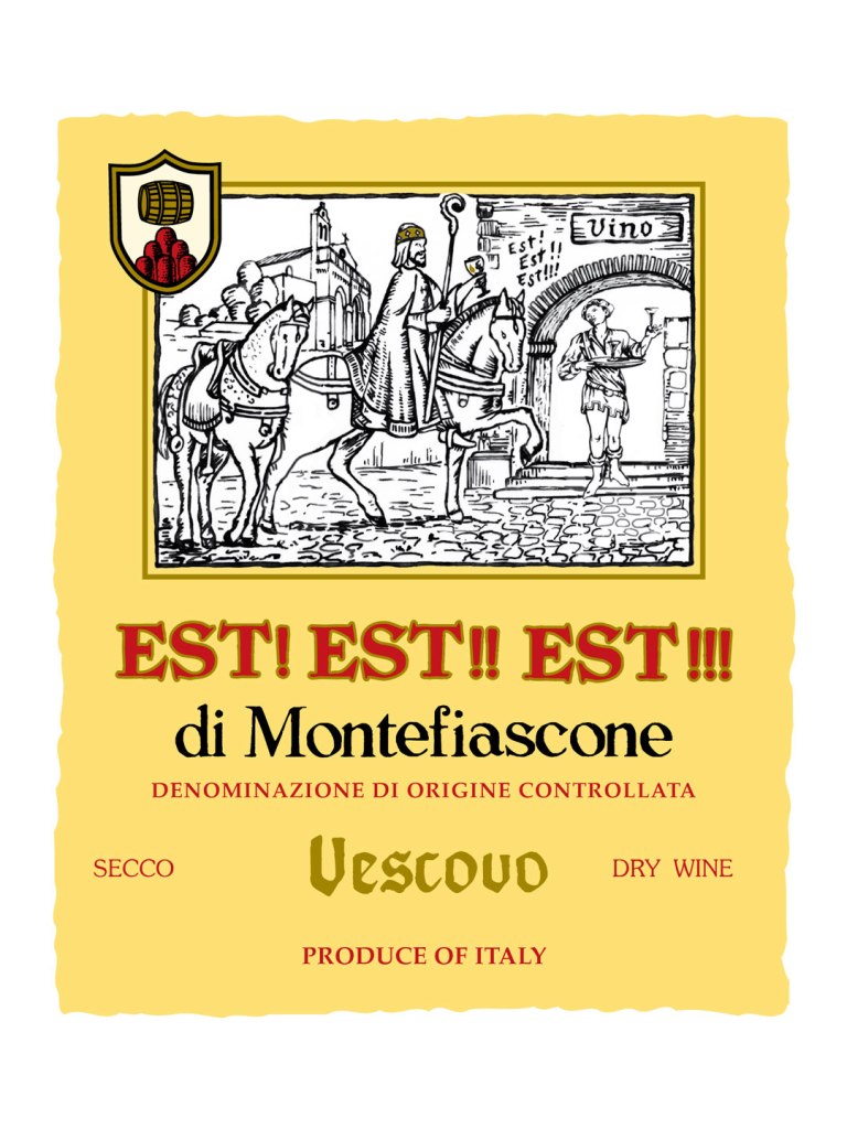 Il vescovo, per evitare spiacevoli sorprese durante il lungo viaggio, affidò al proprio servitore di fiducia, Martino, il compito di precederlo lungo il cammino e individuare le locande con vino degno della sua tavola. L’istruzione era semplice: scrivere la parola latina “Est” (cioè “c’è”, “è buono”) sulla porta delle taverne dove si servisse vino di qualità. La leggenda vuole che, giunto a Montefiascone, Martino fosse talmente entusiasta della qualità del bianco locale da segnare sulla porta della locanda “Est! Est!! Est!!!”, triplicando l’indicazione per sottolinearne la straordinarietà.